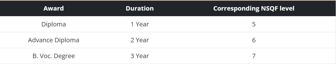 Similarly, there are other exit points from where the students can take an Advanced Diploma or a full-fledged B.Voc Degree. The focus of this Programme is to provide students with in-depth knowledge of practical aspects to handle the complexities of tasks in the real work environment. B.Voc. courses are considered to be a new generation training programme.